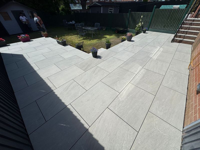 Porcelain slabs such as Kandla Grey reflect light beautifully, resist stains and frost, and need minimal upkeep — a major advantage for busy households. Paired with neat steps or planters, this style suits both modern and traditional Manchester homes.