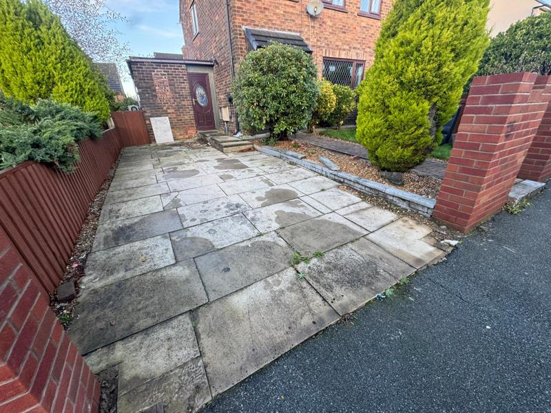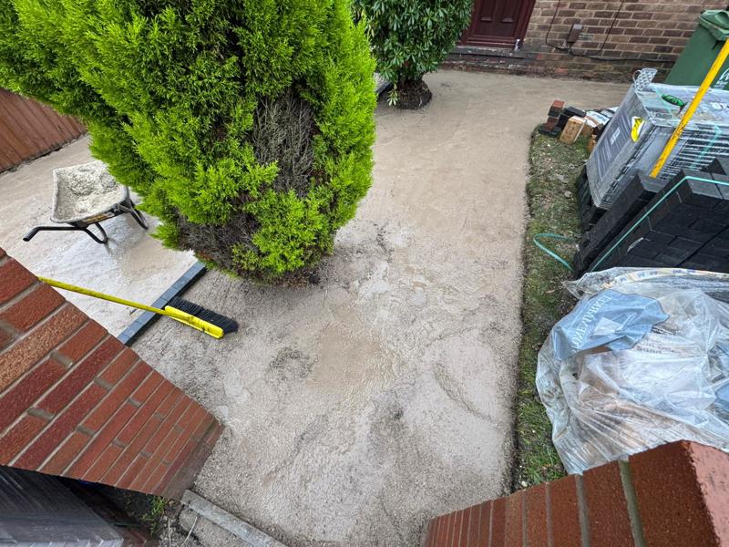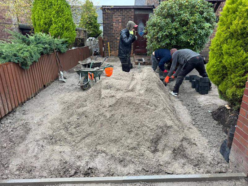 The existing surface was fully removed, including old paving slabs and unstable ground material. Excavation was carried out to the correct depth to allow for a strong sub-base, screed layer, and block thickness. Particular care was taken around the shrubs and entrance steps to preserve surrounding landscaping while reshaping the layout.