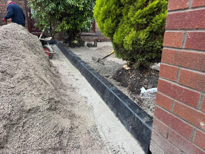 Charcoal block edging was installed to define the driveway perimeter and create the raised planting borders. These kerbs were bedded securely into concrete to lock the paving in place and maintain long-term edge stability.