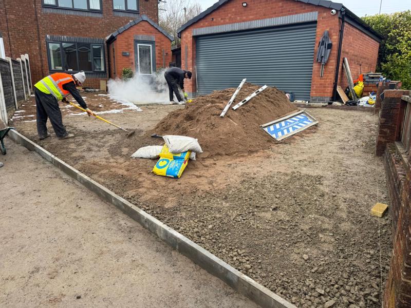 A reinforced Type 1 MOT hardcore foundation was installed and compacted in multiple layers using a vibrating plate compactor. This creates a solid structural base capable of supporting vehicle weight while preventing future movement or settlement.