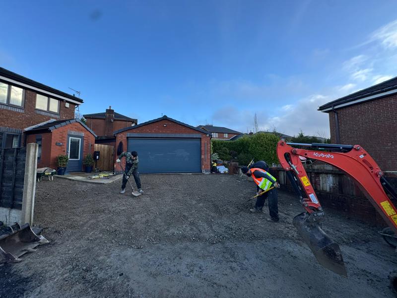 The existing surface was fully excavated and removed to the correct depth, ensuring sufficient allowance for a strong sub-base, bedding layer, and block thickness. The area was cleared of all loose material and shaped to provide correct drainage falls away from the property and garage.